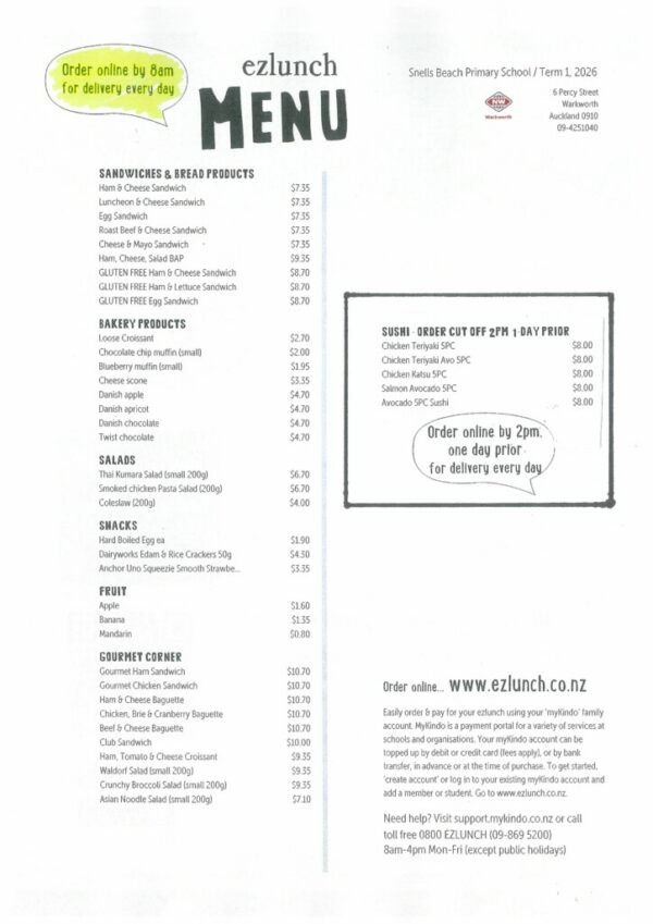 Here at Snells Beach School we have lunch-ordering through Ezlunch available every day. Follow the link below to sign up for ezlunch and check out the menu. Sushi is available and needs to be ordered the night before whilst sandwiches/baking/other lunchbox items from New World can be ordered up to 8am of the same day. Please note, the lunch order is delivered right before our 1pm lunchtime so students still need to bring morning tea with them. Please contact the school office if you have any questions.